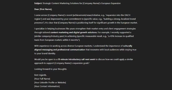 - Subject Line: Keep it professional and specific, such as “Strategic Content Marketing Solutions for [Company Name]’s European Expansion.”