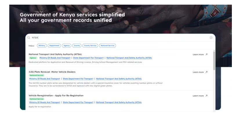 If you are logged in to the eCitizen website homepage, a prominently displayed search bar is displayed. Just type in “NTSA” and hit the first link that appears for NTSA services. You will be redirected to the comprehensive NTSA list of services available on the platform. Now, to access the NTSA portal within eCitizen, there is another search bar where you must type “Online Search-Copy of Vehicle Register Record“ and tap on the link that appears. You will be immediately logged into the NTSA portal section on eCitizen, where all vehicle-related services are centralized for your convenience.