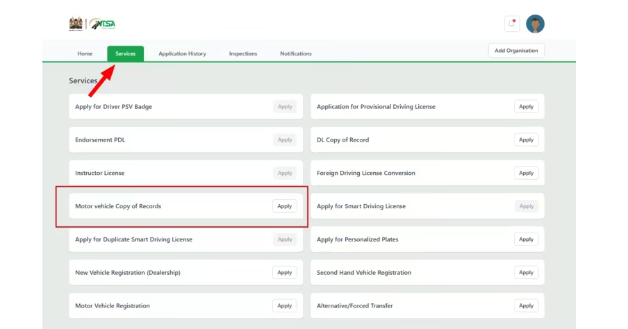 Once logged in on your homepage, you can see various available services, including your driving license details and other personal information. However, don’t be distracted by all the other options available. For our specific purpose, navigate to the “Services” tab and click on it. Once the page loads, you will see several services offered by NTSA, but since we are interested in motor vehicle search specifically, go to the first column of the service section in row number four and click the “Apply” button just beside the “Motor Vehicle Copy of Records” option.
