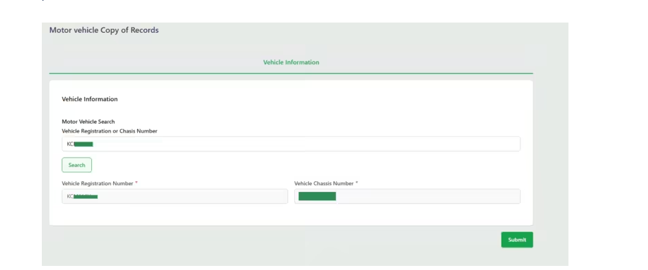 This step is where accuracy becomes crucial for successful results. After accessing the copy of records service, as covered in the previous step, the next interface will prompt you to provide specific vehicle identification details. In this particular step, you need to provide either the vehicle registration number (number plate) or the chassis number. Both pieces of information are acceptable, but the registration number is typically easier to obtain and verify.